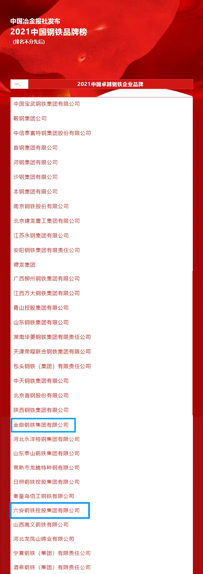 品牌是企業乃至國家綜合競爭力的重要體現。5月10日,第五個中國品牌日之際,中國冶金報社隆重發布2021年度中國鋼鐵品牌榜。方同舟控股下屬金鼎鋼鐵集團、六安鋼鐵控股集團雙雙榮膺“2021年度中國卓越鋼鐵企業品牌”榮譽稱號。