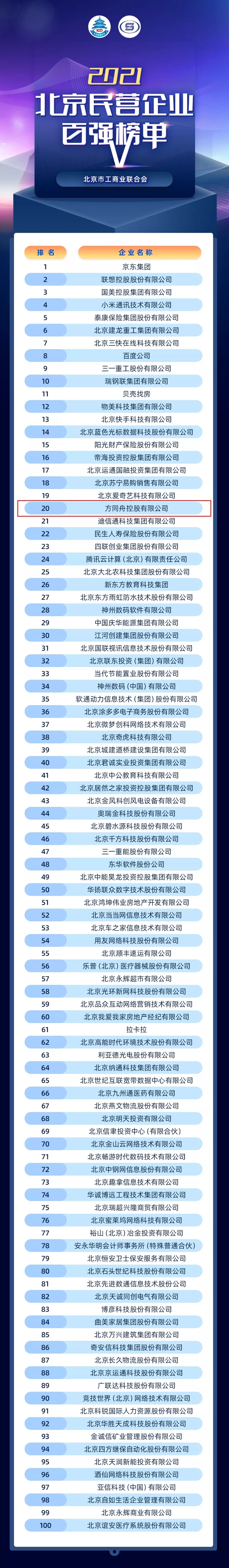 方同舟控股憑借卓越的企業(yè)綜合實(shí)力、優(yōu)異的市場表現(xiàn)等,從全市共2416家企業(yè)中脫穎而出,榮登“2021北京民企百強(qiáng)”榜單,位列第20位,行業(yè)領(lǐng)軍地位不斷夯實(shí)。